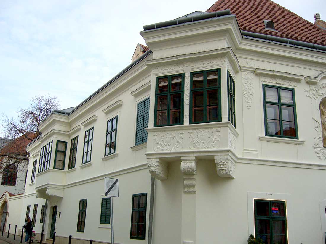 Az épület Városház téri oldalának ablakpárkányait és sarokerkélyét gazdag és változatos rokokó stukkódíszítés borítja. A sarokerkélyt szakállas kőfej tartja. A barokkos függönydíszítéssel keretezett szoborfülkében Szent Sebestyén szobra látható.
